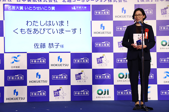 - 手帳を購入した時に案内が入っていたので興味を持ちました。私の中に大切にしていた言葉をだれかに知ってもらえたらいいなと思い応募しました。(佐藤恭子さん/名言大賞・いとうせいこう賞)