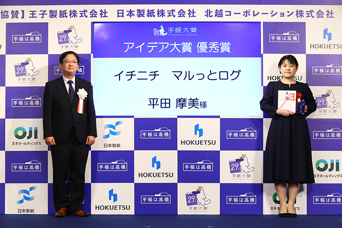 - 普段から手帳や日記の工夫やアイデアを自分なりに考えていたので、その中でも“あったらいいな”と思うアイデアを応募させていただきました。こだわりは誰でも使えること。そして、日々の記録を手軽にできる点です。こだわりポイントは「今日あったいいこと」の項目を作ったことです。その日がたとえば運が悪いなと思う日でも、今日あったいいことを1つでも見つければ、まあ今日も悪くなかったな、と前向きになれると思うのです。(平田摩美さん/アイデア大賞・優秀賞)