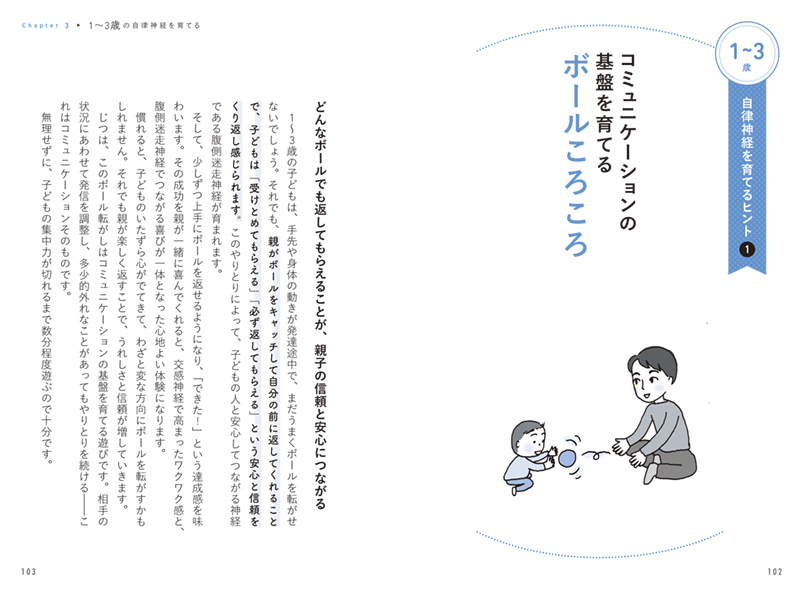 細川貂々さんのかわいいイラストとともに、各年齢の発達ペースに合わせて 自律神経を育てる遊びや習慣 を紹介しています。ボールころがし、砂遊び、ぬいぐるみを抱く、毛布にくるまる、ないしょ話をするなど、どれもシンプルな方法ですが、トラウマケアの現場でも使われている、効果が実証されたものです。