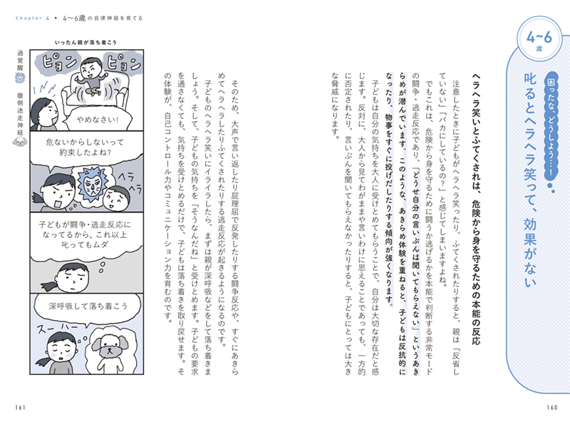 0歳、1~3歳、4~6歳、7~12歳の年齢別に、その時期の自律神経の発達具合について紹介しています。各年齢でどんなことができるようになっているのか、この時期は何を伸ばしていけばいいのかを神経科学をベースにわかりやすく解説しています。
