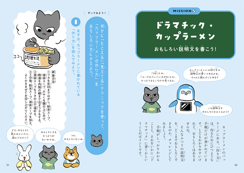 導入マンガ、ミッション④インパクトライティング(インパクトスタート、クリアストーリー、ドラマチックフィナーレ) ⑤ドラマチック・カップラーメン ⑥書くことない日記、ほかにもある!なぜか書きたくなっちゃうお題いろいろ、特集:作文のルールをおさらいしよう ミッション⑦禁止ルール ⑧ルパンタイム おしえてぬまっち!Q&A「辞書を引くのがめんどくさい…引かなきゃダメ?」