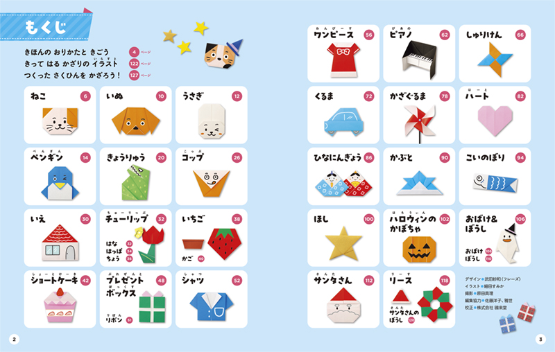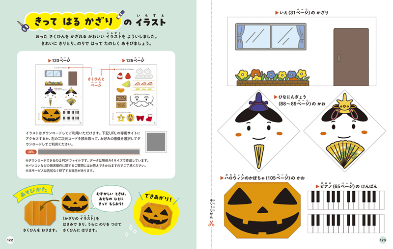 巻末には作品に貼れる「切り取り式のイラスト」と、作品を貼って飾れる「おりがみの台紙」を収録。ダウンロードもできます。