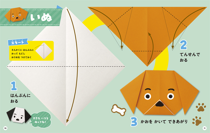 本書は、一般的な折り紙(15cm×15cm、またはその4分の1サイズ)の原寸大で折り図の写真を掲載しています。紙面は折り図を読み解くことがまだ難しい…というお子さんでも挑戦しやすいように工夫しています。ひと折りひと折り見比べたり、写真に重ねたりしながら折れば、作品を完成させることができます。お子さんの「じぶんでできた!!」の道のりをやさしくサポートします。