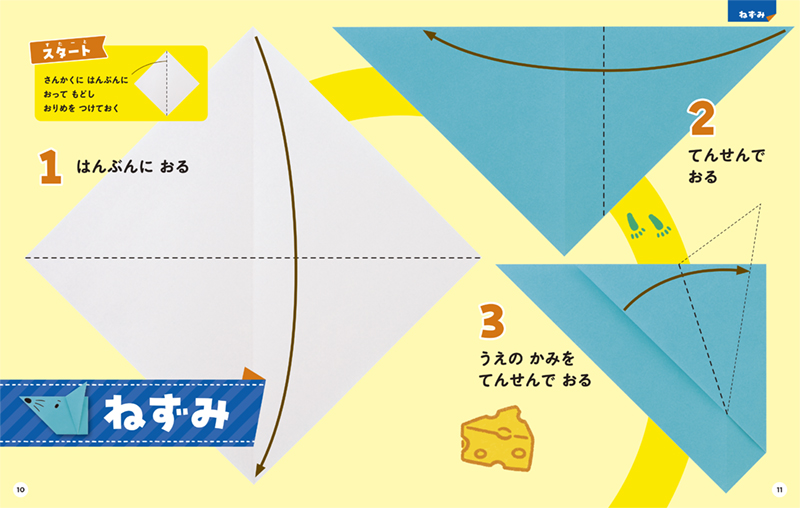 一般的なおりがみの大きさで、折る工程をそのまま紙面に再現。