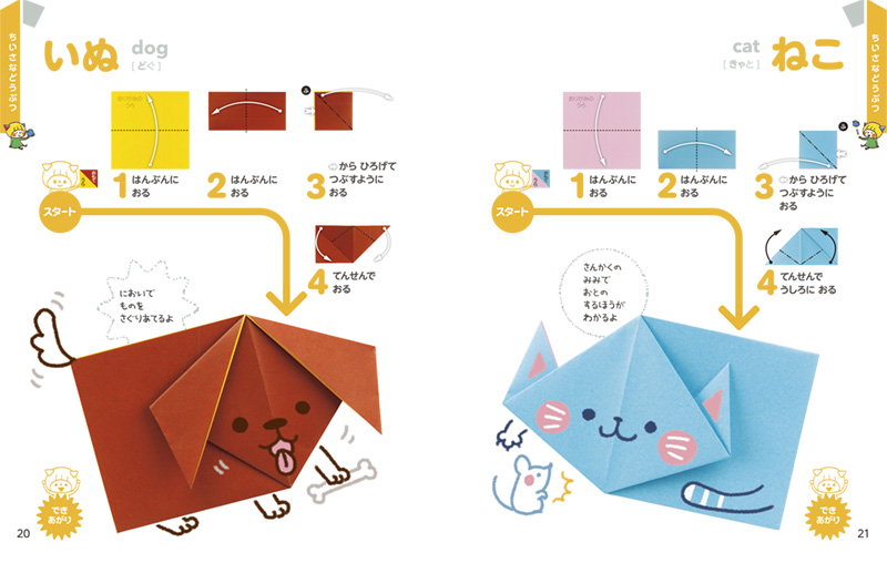 日本伝統の遊びである「おりがみ」は、いろとりどりな紙を使って、動物、恐竜、洋服、食べ物…といくつもの作品を生み出すことができます。この本では、はじめての子でも紙1枚、5回以内でかんたんに折れるものを、子ども達の好きな11テーマに分けてたっぷりと集めました。ぜひ親子で一緒におりがみ遊びを楽しんでください。