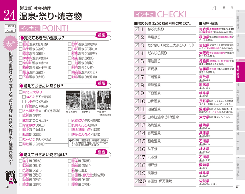 試験を熟知した著者が、「頻出テーマ」と「出題ポイント」を厳選! 例えば、意外にも頻出する「温泉」。各温泉地がどの県にあるか、答えられますか?