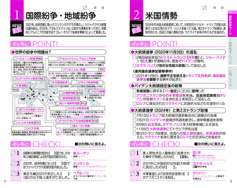 ニュースや新聞に目を通すだけでは、時事問題の前後関係まではなかなか理解しがたいもの。この本を使えば、最新時事テーマを関連キーワードと共に流れで「イッキに」覚えられます。持ち運びやすいサイズなので、ぜひカバンの中に入れて移動のお供にして頂ければ幸いです。