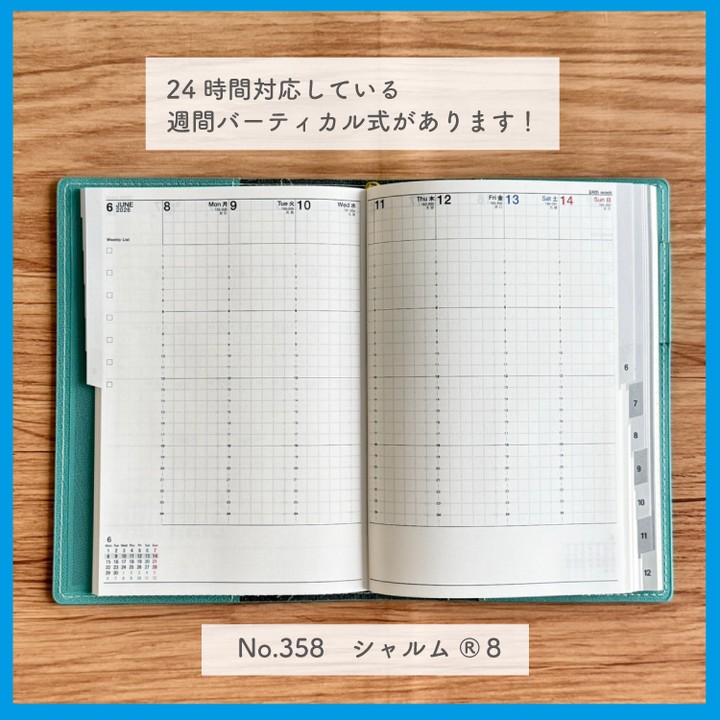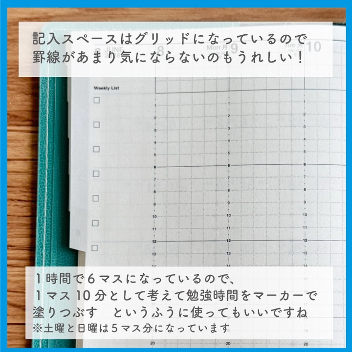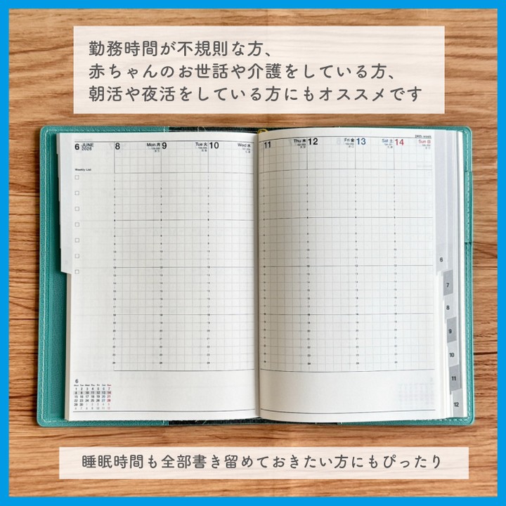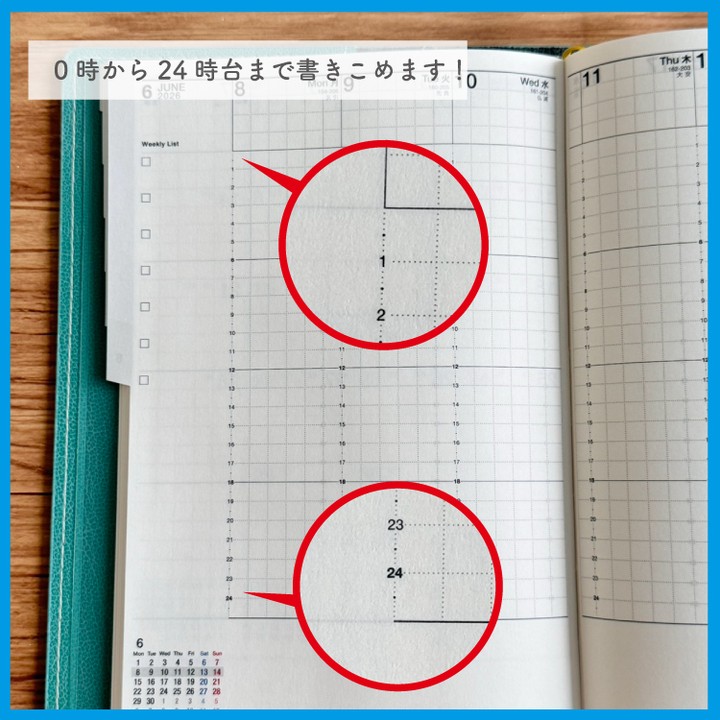 24時間対応にしている分1時間あたりの記入スペースの天地幅が少し狭くなりますが、平日スペースは横幅を少し広めにとっているので書き込みもしやすくなっています。