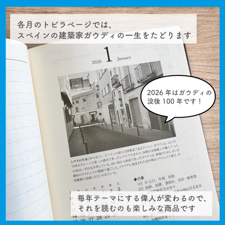 毎年一人の偉人をテーマにして、カバーや各月のトビラページには偉人にまつわる場所の写真やエピソードを紹介しています。