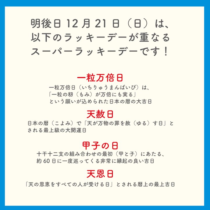 もしまだ書き始めていないようでしたら、2025年最後のスーパーラッキーデーである12月21日(日)に書き始めるのはいかがでしょうか?